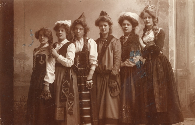 Titel: Ateljébild unga telefonister i folkdräkt, från vänster 1 Edith Linqvist telefonist, 2 Anderberg gift Frögelius, 3 Karlmark, 4 Mia Holmqvist gift Törnberg telefonist, 5 Joachimsson, 6 Hildegard Holmqvist.