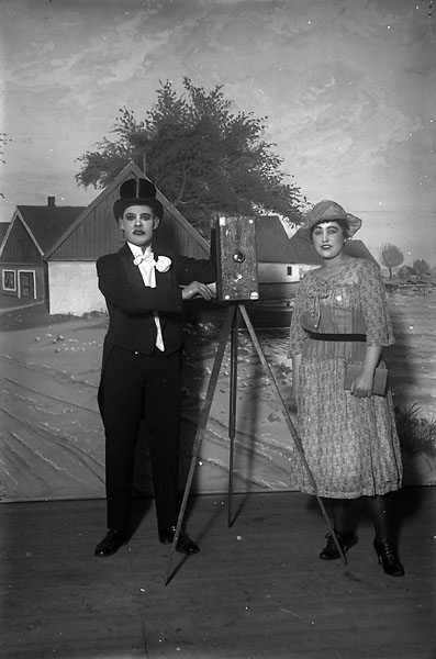 Revybild, man med kamera och en kvinna, ”vy 1920 A” på asken