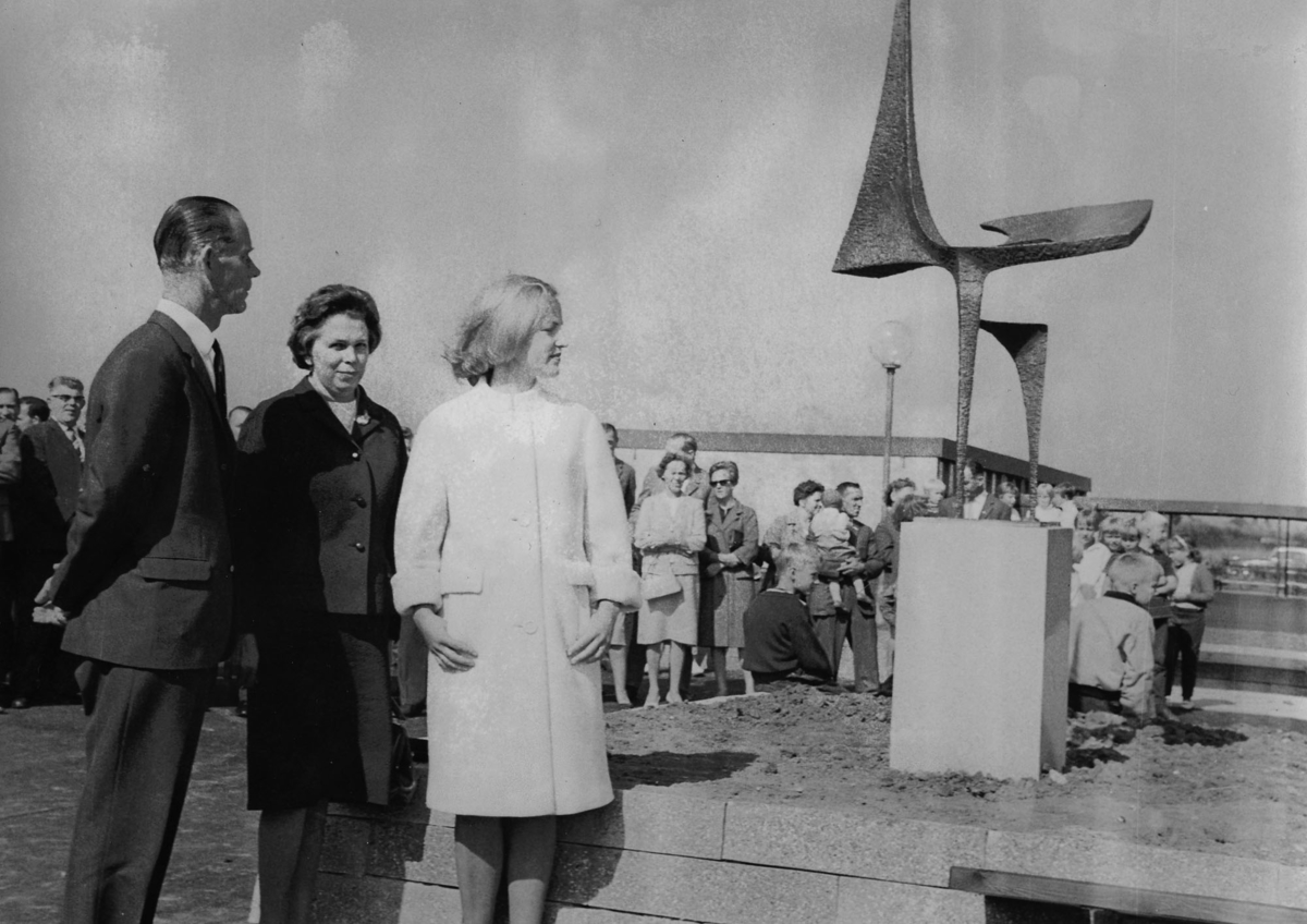 Byggmästare Sture Lindsjö med fru överlämnar konstverk till Pilevallsskolan, bakom Sture är Malte Ohlson.