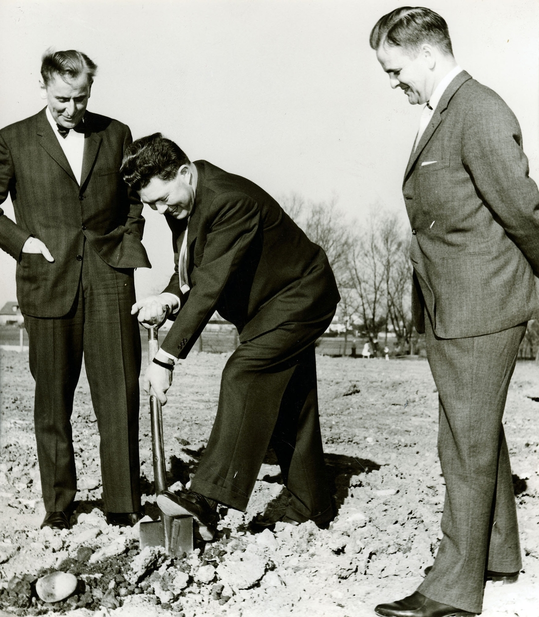 Tage Mårtensson tar första spadtaget till sin nya verkstad hörnet Stavstensvägen- Magistergatan, Stjärnfoto Bert Olsson tel 3455, 17/4-61.