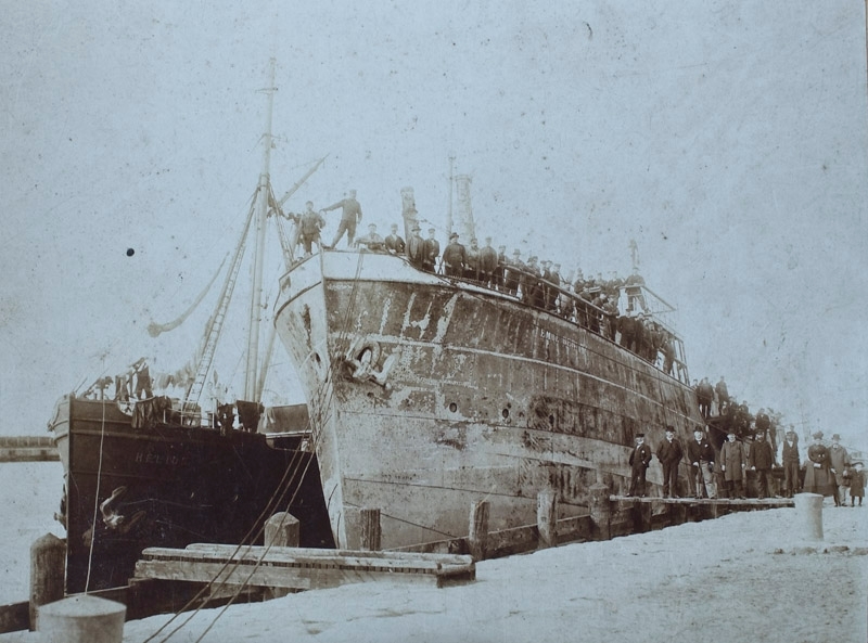 Fartygen Helios och Emil Berenz(polskt?) vid kaj, A Schröder, Photogr.-Anstalt Neufahrwasser, Sasperstr.
