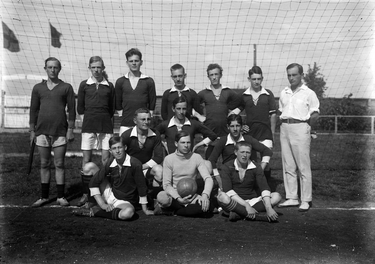 Utetagning vy 1920. Fotbollslag uppställda för fotografering.