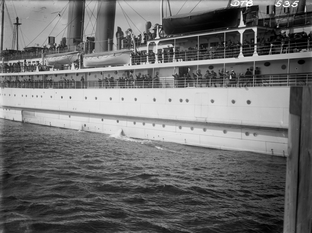 Färjan sett från Allehanda, många människor som vinkar. Konungen Gustav V..
