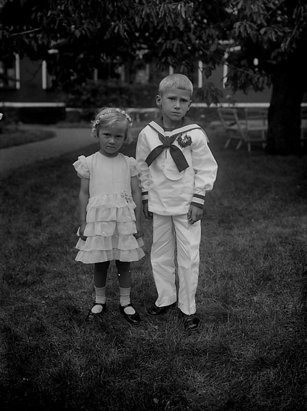 Brudpar Nilssons brudnäbb en flicka och pojke under ett träd hon i klänning och han i sjömanskostym.