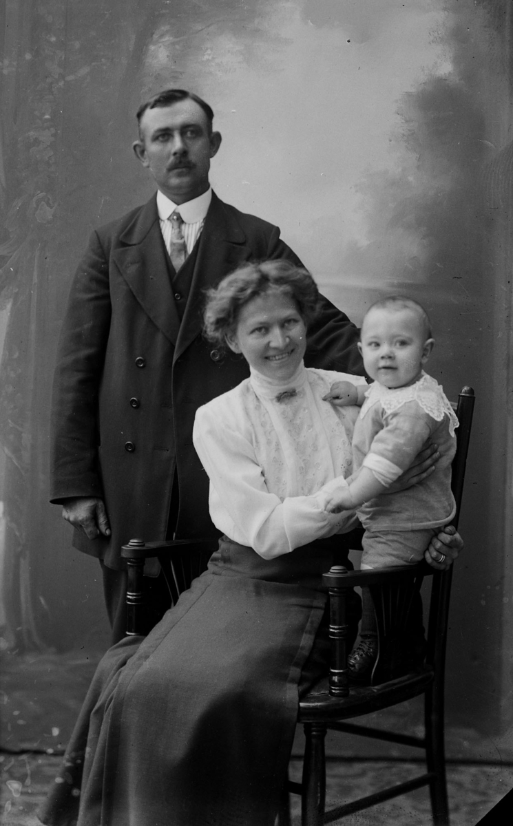 Ateljébild, familj (far,mor, barn) metallutfällning.