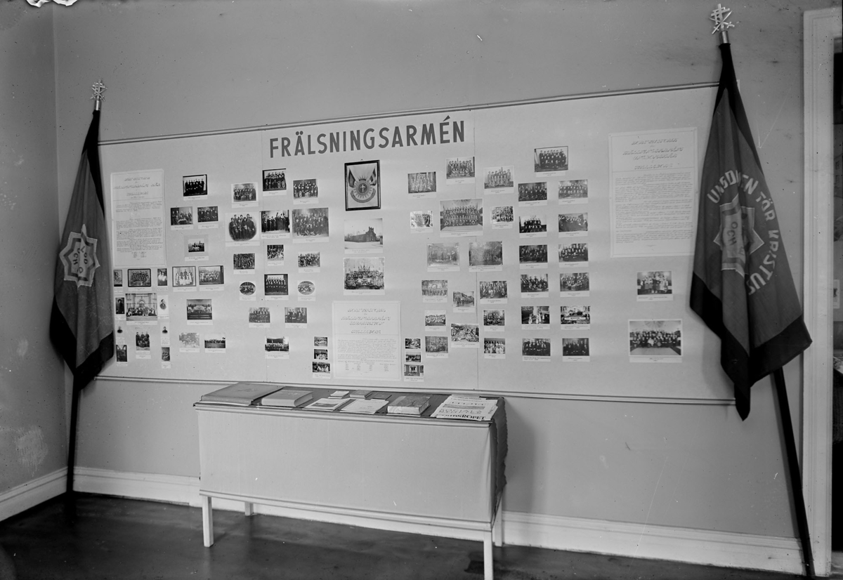 Skylt Frälsningsarmén fotografier, flaggor, gul missfärgning i kanten. ”Trelleborgs Skyttsgård”. ”Trelleborgs 75:års jubileum 1942 Skyttsgården, utställning”.