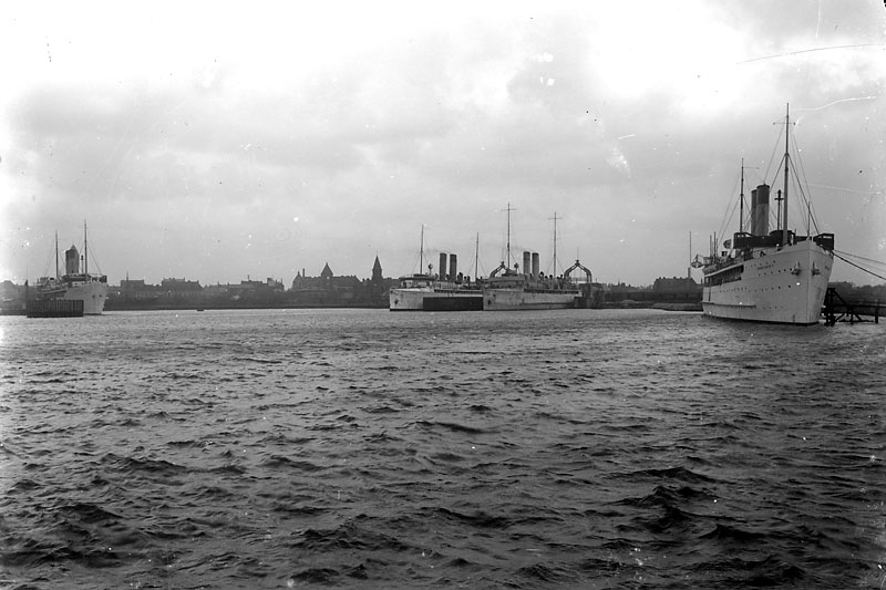 Stan sedd från havet, fyra fartyg varav ett Konung Gustav V ”1915 C” på asken metallutfällning, bruna fläckar.