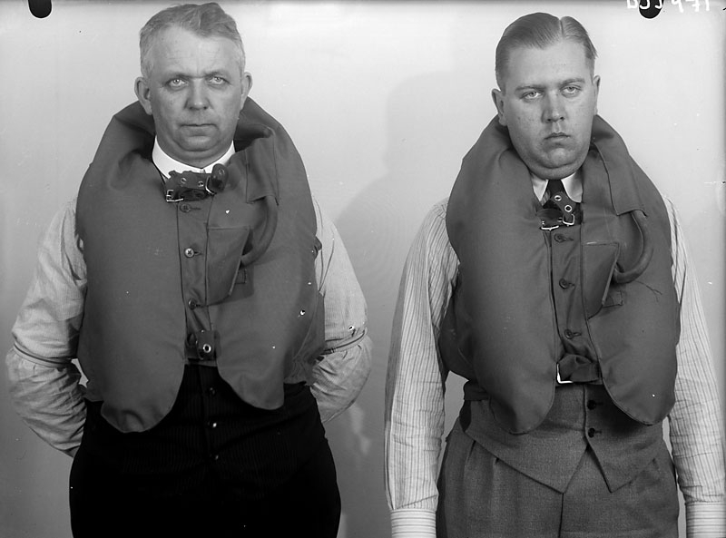 Ateljébild, två män i flytvästar till vänster i bild Julius Johnson. Gummifabriken 1936
