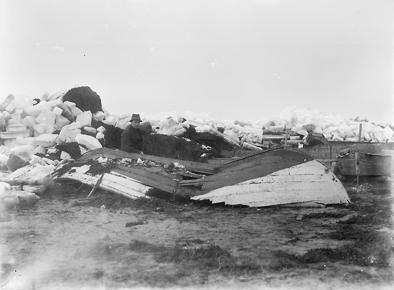 Isvinter. En man sitter vid en trasig fiskebåt, eventuellt sönderslagen av isen. Högar med isflak i bakgrunden.