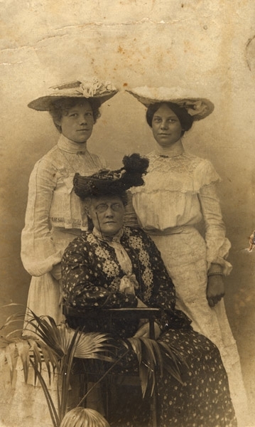 Ateljébild 3 damer, Matilda Hansson, Maria Larsson, 2 unga kvinnor bär vita klänningar, äldre kvinna bär pincené.