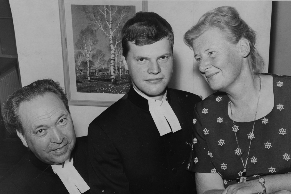 Prästvigning var det på söndagskvällen I Lunds domkyrka efter aftongudstjänsten. Där vigdes Per Frostin från Trelleborg, som är sveriges yngsta präst, endast 22år. Hela familjen samlade från vänster Ernst Frostin, Pastor Per Frostin och Greta Frostin. Stenbergs bilder Malmö, 25/5-30/5-1964.
