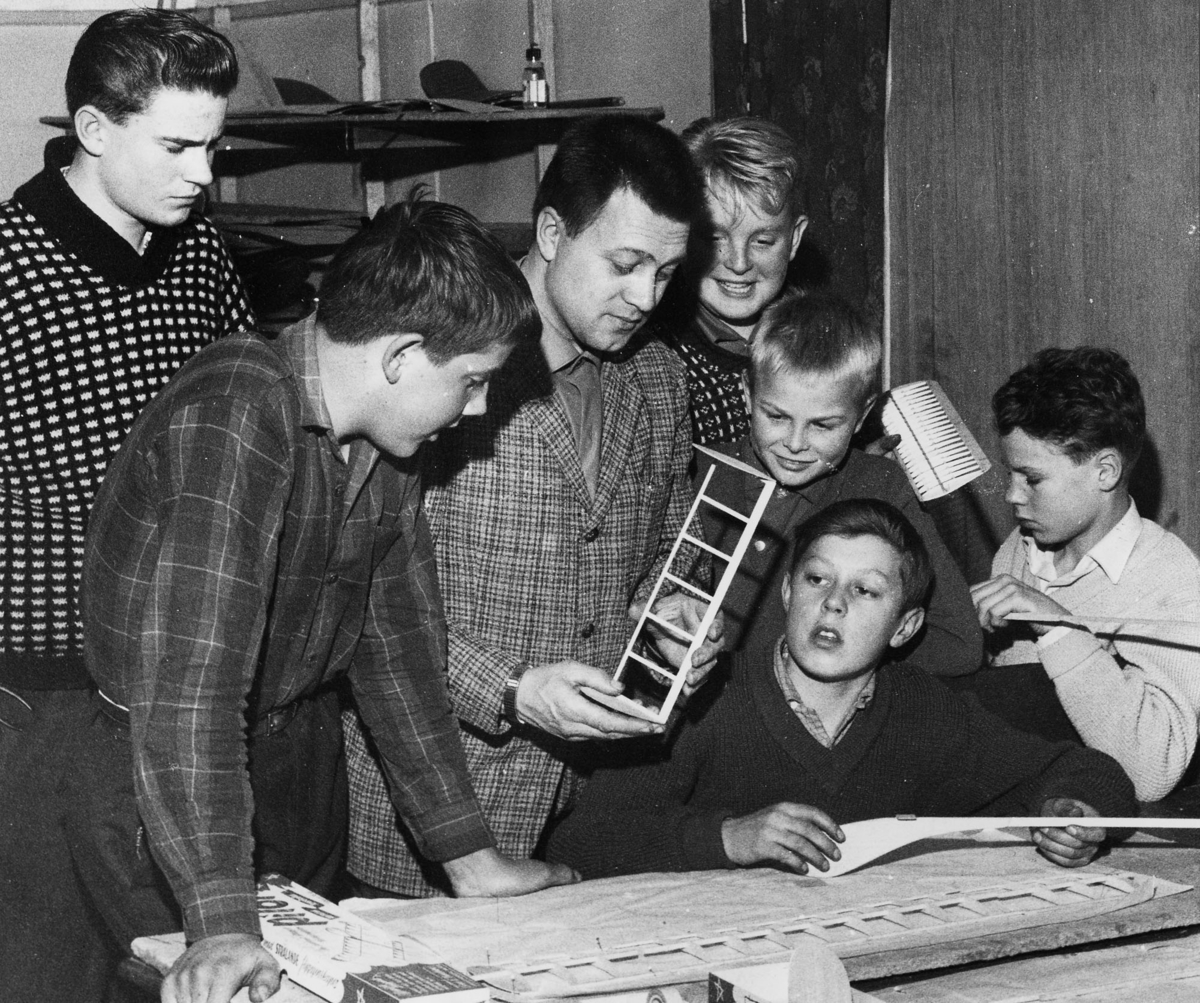 Arne Friberg instruerar unga medlemmar i modellflygklubben, 7/11.62. Cederholm Foto Helge Bengtsson Östergatan 13 Trelleborg telefon 1421.