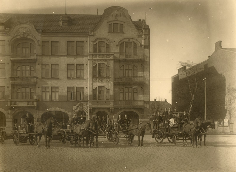 Brandkåren har uppvisning på Stortorget, Kolsyrespruta, stegvagn, ångsprutorna 1 och 2.