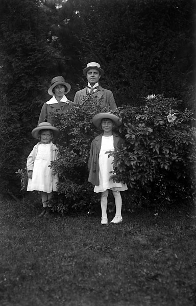 Man, kvinna och två flickor i en trädgård. Johnsons privata bilder.