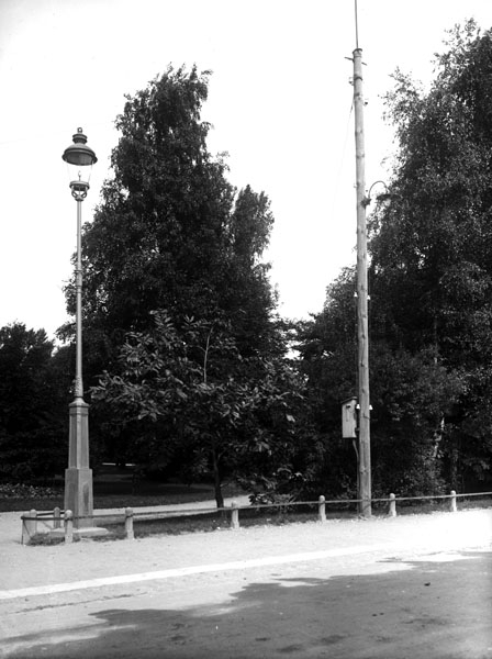 Två elektiska stolpar, bakom dem många trä.
