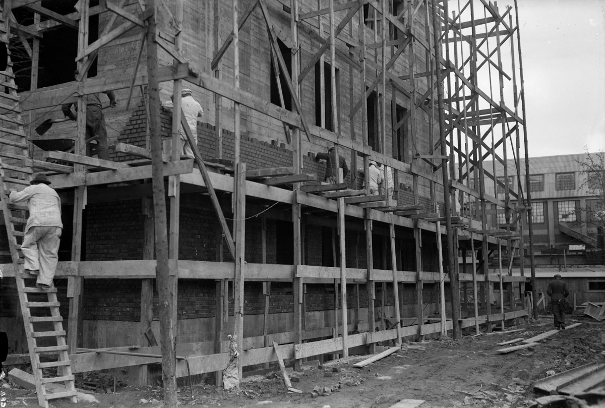 Hörnet av Johan Kocksgatan-Gutenbergsgatan. Bygge , tegelsättning.