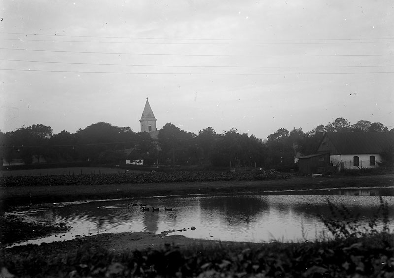 Bild med ankdamm, två gårdar och en kyrka, ”utetagning 1919D” på asken