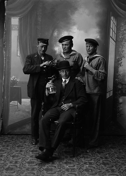 Fyra män med flaskor i händerna varav två i flottans uniform, ateljébild, ”1919K” på asken