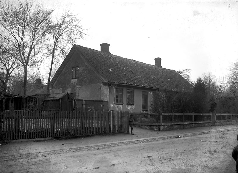 Hus med liten trädgård och uthus, en pojke står framför huset, ”vy 1920” på asken