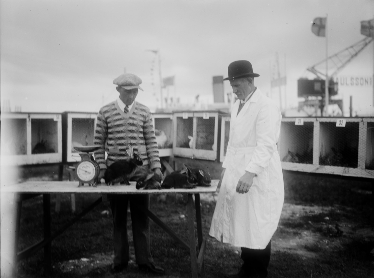 Lantbruksmöte 1931. Kor på utställning. Smådjursutställnig, 4 kaniner på ett bord. Två karlar.