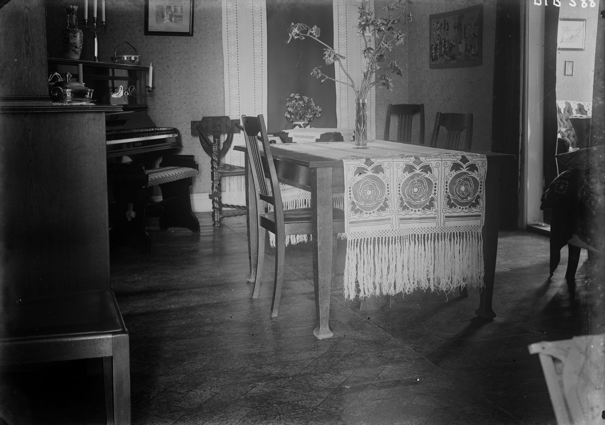 Utetagning 1917-1918. Rum i privathem, matsalsmöblemang och piano.