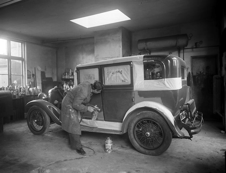 Bilsprutning Malmö. Interiör verkstad eller industri. En man sprutmålar en bil.