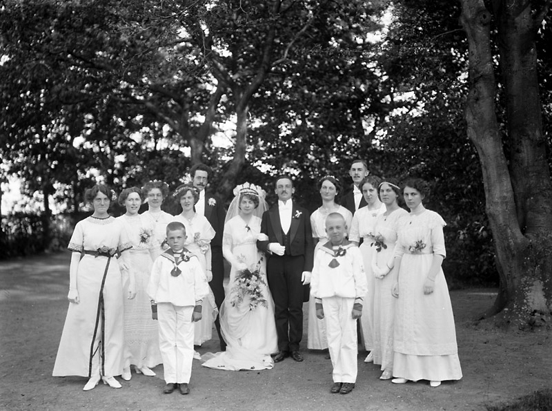 Brudpar med anhöriga utomhus.