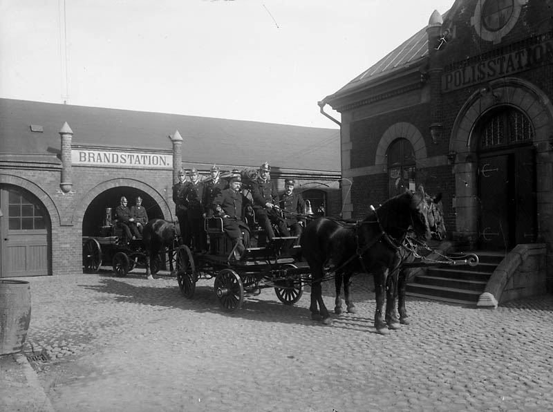 Brandkåren 1:a utryckning, med kolsyrespruta samt ångspruta. Två vagnar med brandsoldater framför gamla brandstationen.
