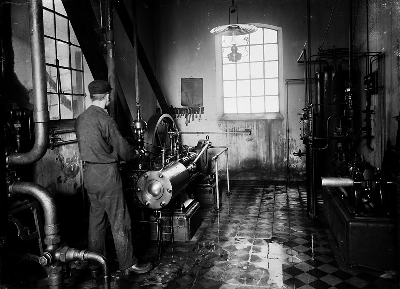 Interiör från okänd industri . En man står vid en ångmaskin.