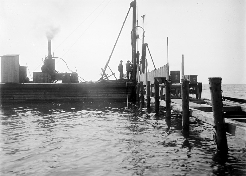 Trelleborgs hamn. Nyhamnen byggs. Pålning av spont.En ångmaskin driver hejaren.