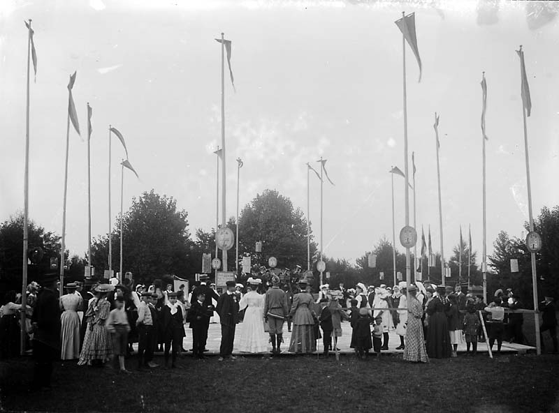 Barnens dag. Fest utomhus. Mycket folk, vimplar och orkester.