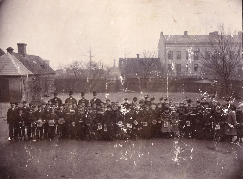 Elementarskolan i Trelleborg, firandet av Gustaf Adolfsfesten 1894, Södra skolgården med rektor, lärare och elever, foto fr. N mot S. den (6nov 1894?) i fonden hamnen. Skolgården begränsas av ett träplank, med portgrind. Till höger Rektor Sjövalls hönshus vid planket, därintill ett boketräd(Fagus) Husen: från vänster 1: Skolans hemlighus (under skiffertak) sammanbyggt med 2: ”Rektor Sjövalls tvättstuga”, m duvslag på taket. 3: ”Skräddare Ant. Nilssons hus” 1-vån. med 1st. skorsten, bel. Å tomt nr. 19 (59B) inom kv. Herkules. 4: ”Tryckarehusen” 2 våningsbyggn. Uppf. Av boktryckarna Sandberg och Jönsson å tomt nr 20 (61B) inom kv. Herkules. Äldre personer från vänster: 1: Rektor Hjalmar Sjövall, fil dr 2: Kollega Elof ,fil dr 3: Kollega John Smith, fil dr 4: Kollega Alexander Rydberg, pastor
