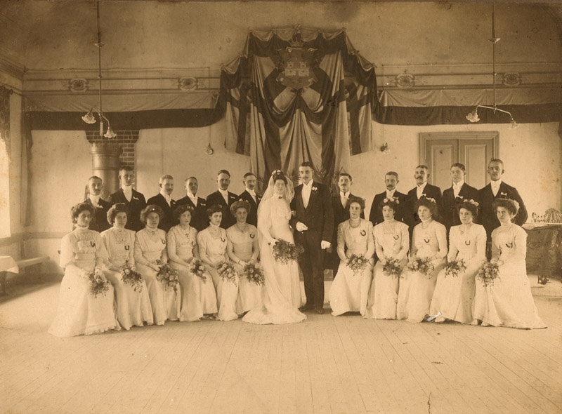 Bröllopsfoto, gruppbild, interiör, brudpar med 11 herrar och 11 damer(alla damer klädda i vitt) Andersson dotter, 4st, gåva av fru Stillén, 67:1025.