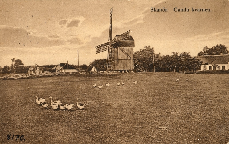 Gamla kvarnen i Skanör, gäss spankulerar i förgrunden, Skytts härad, 8170.