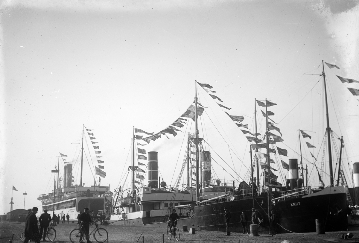 Båtar. Båtar med flaggspel i hamnen. En av de är Konung Gustav V. Den andra är Knut.