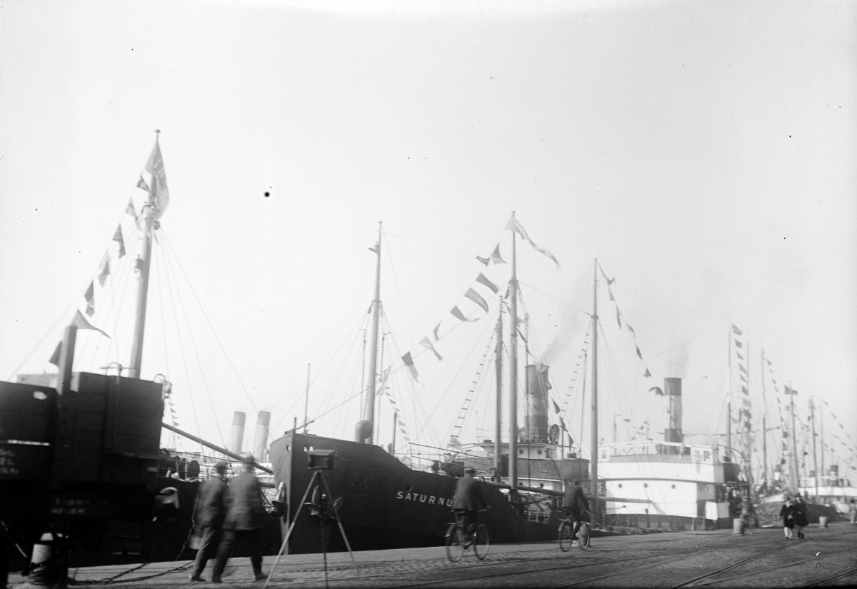Båtar. Båtar med flaggspel i hamnen. En av de är Saturnus.