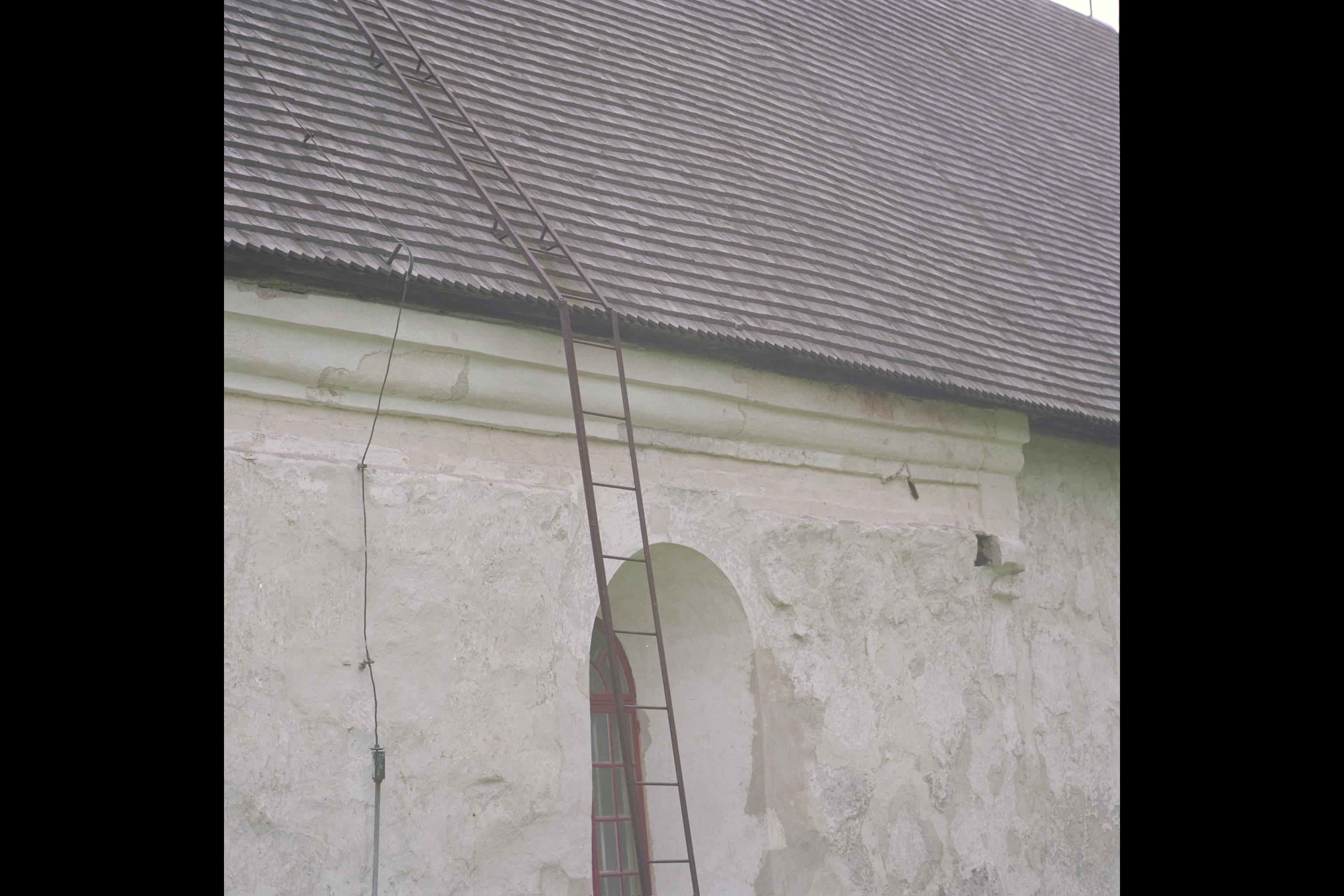 N fasaden, stötfog mellan långhus och västparti som saknar gesims.
