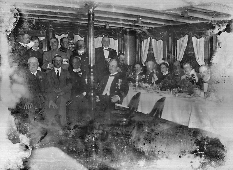 Första världskriget. Män och kvinnor i högtidsdräkt eller Röda Korsuniform ombord på ett fartyg.