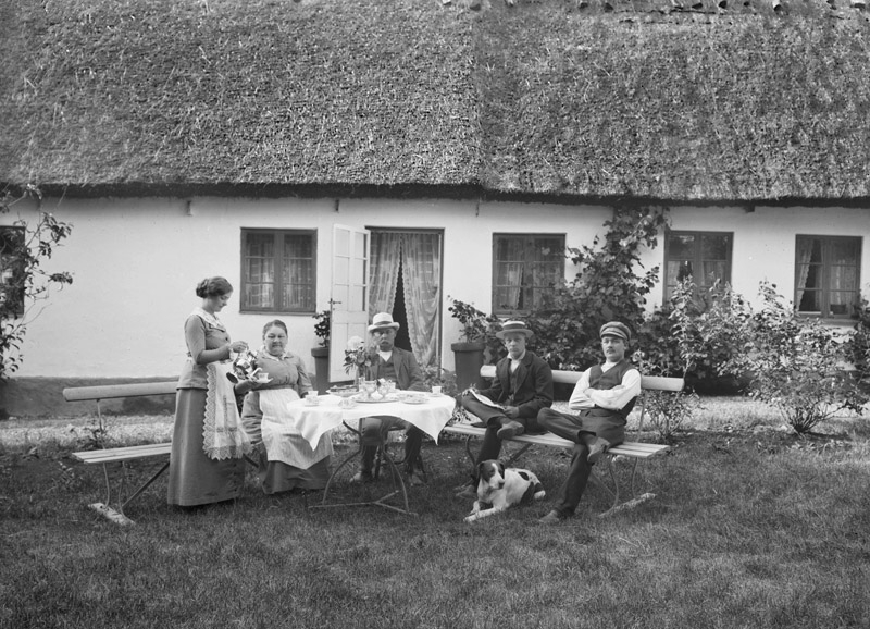 En lantgård. Framför huset sitter tre män, två kvinnor och en hund runt ett dukat kaffebord.