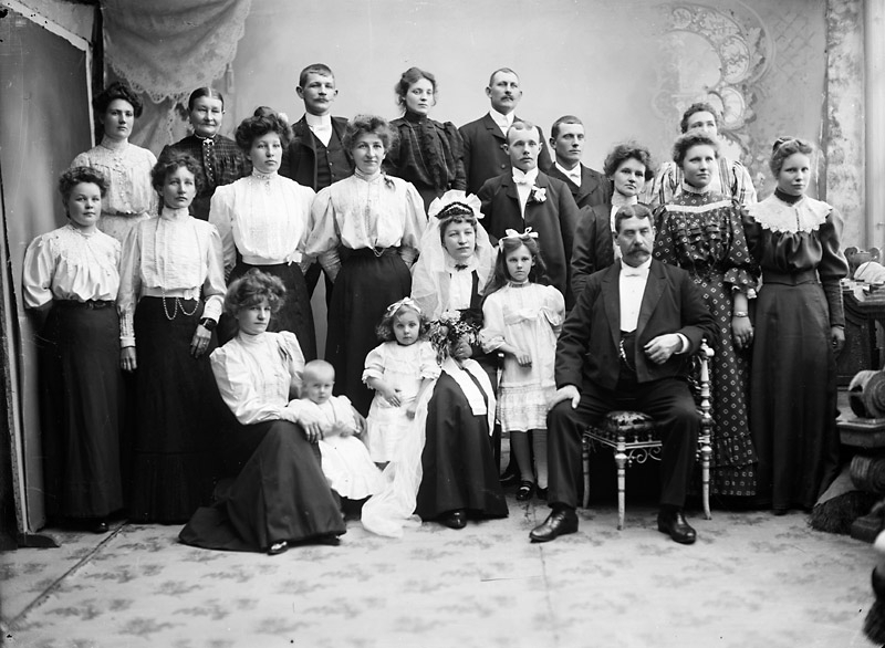 Bröllopssällskap i fotoateljé. Brudpar med anhöriga. Hansson.