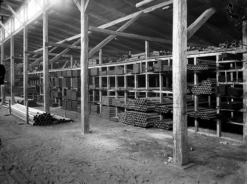 Okänd industri. Interiör. Hyllor med rör.