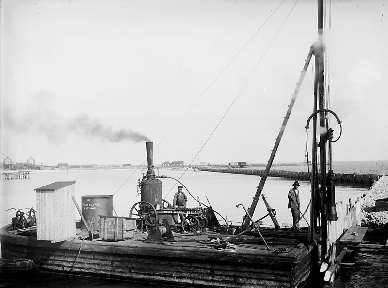 Trelleborgs hamn. Nyhamnen byggs. Pålning av spont.En ångmaskin driver hejaren.