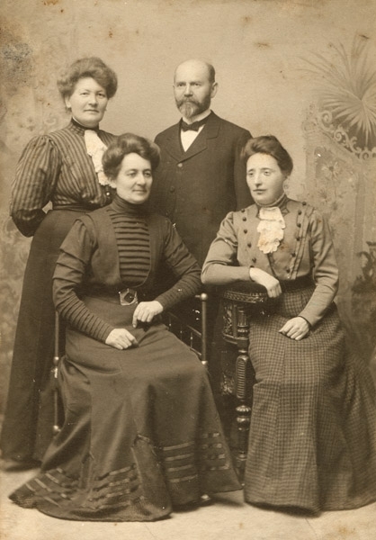 Fru Rosén f. Hellström, folkskollärare Johan Rosén, hårfrisörskan Ada Hellström syster till fru Rosén, manufakturhandlare Calla Bügge, foto: Alf Hansen Bredgade 22 Köpenhamn, 24 okt 1909.