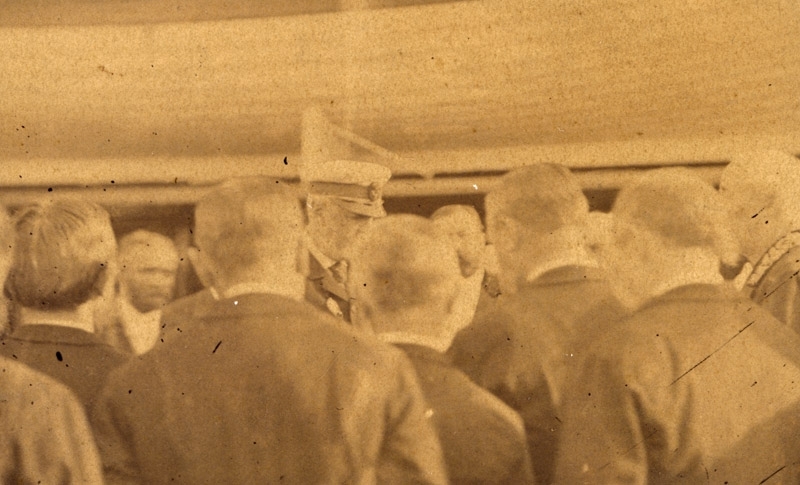 Konung Oscar II ombord å Drott i Trelleborgs hamn 4 augusti 1890. Han välkomnas av stadens honoratiores.