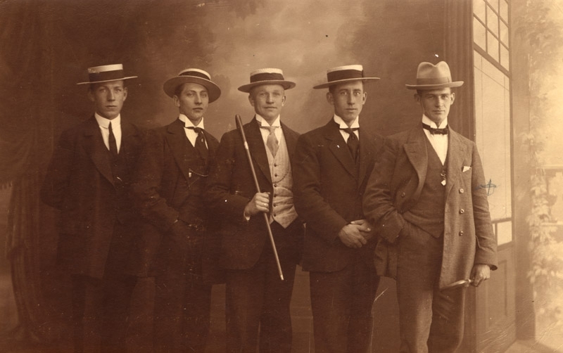 Gruppfoto fyra herrar i mörk kostym och halmhatt, 1 herre ljus kostym och filthatt, längst till höger Carlo Karlsson.