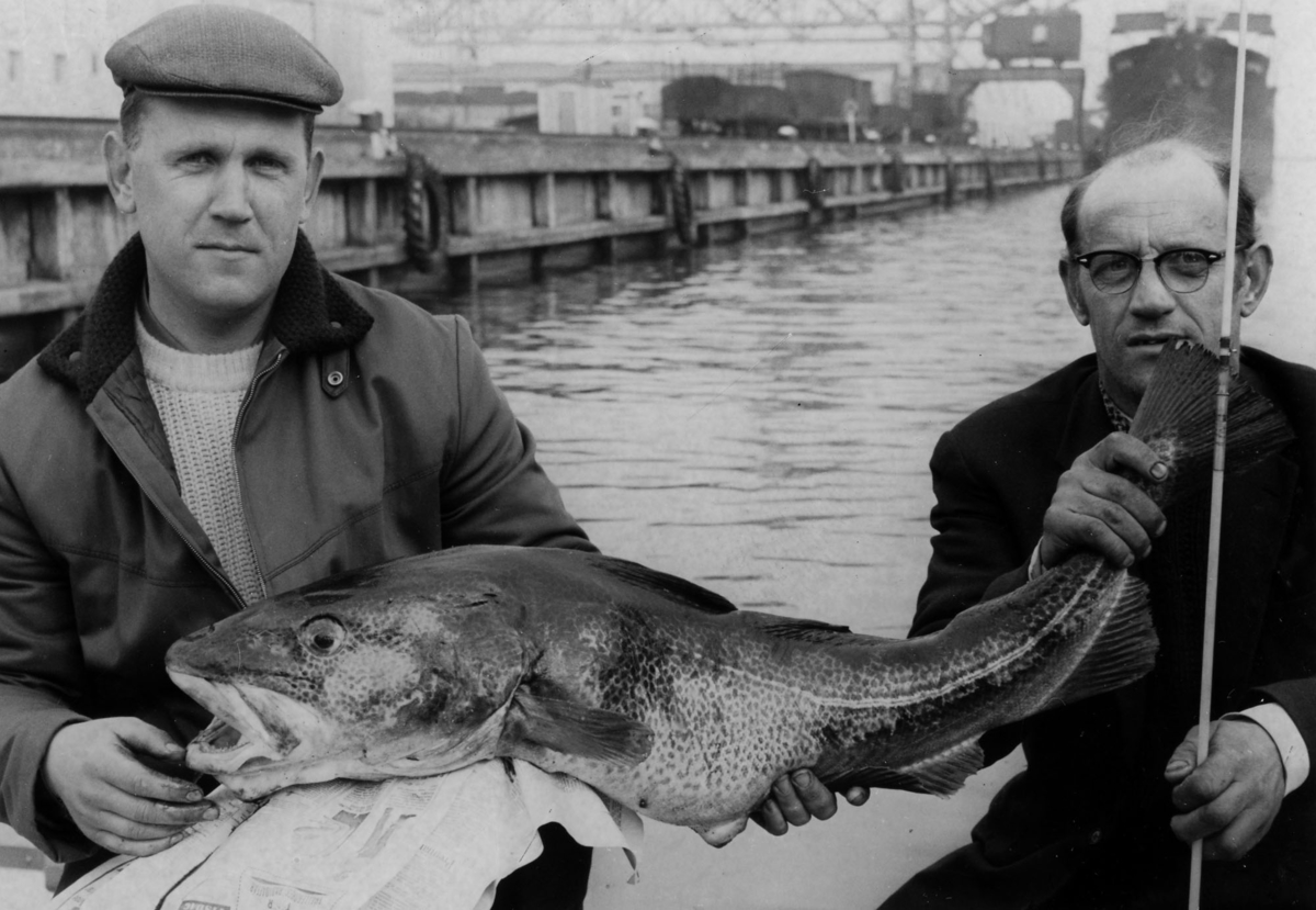 Jarl Wästerfors och Werner Jörgensen med en torsk vid Nyhamnen 24/4-30/4-1966.