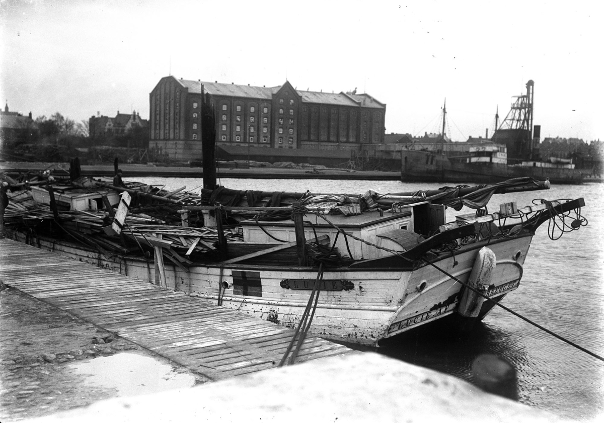 Utetagning 1917-1918. Segel båt i hamnen. Lucie AF. Ångkvarnen i bakgrunden.