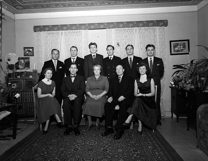 Kjell Nilssons kusiner i "KAMMAREN" på Valdemar Fehrm 60-årsdag 1954, Bryggaregatan 54. Stående från vänster: ALVE Valdemar 1920-2002, FOLKE Reinhold 1921-2009, Ebbe INGEMAR 1938-, HELGE Ruben 1928-2007, ERIK Ferdinand 1922-2016, TORE Emanuel 1929-2000, sittande från vänster: RUTH Ingeborg 1936-, VALDE Harald 1919-1997, ALMA(Nilsson) 1899-1985, Alve VALDEMAR 1894-1974, EDEL Hennie 1933-2006. Kjells far Albert Nilsson 1904-1989 var bror till Alma. De var födda i Skegrie. 31234.