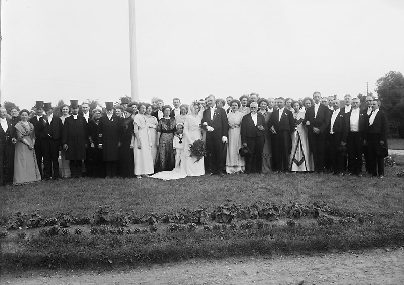 Bröllopssällskap. Bröllop / gruppbild utomhus.