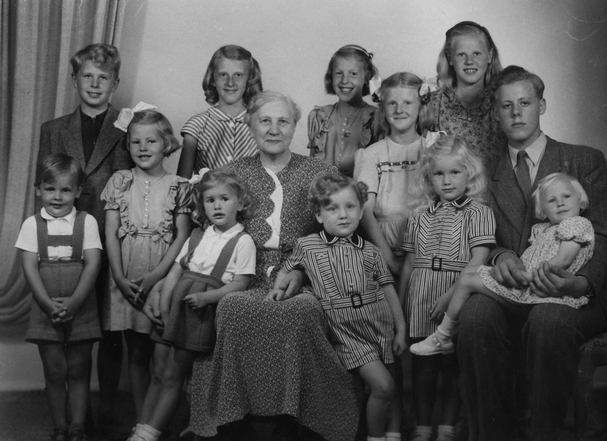 Foto taget i Johnssons ateljéer ca 1948. På bilden sitter Hilda Olsson, född på Upplands gård i Maglarp, omgiven av sina barnbarn. Hon gifte sig sedan med lantbrukaren Olof Persson.